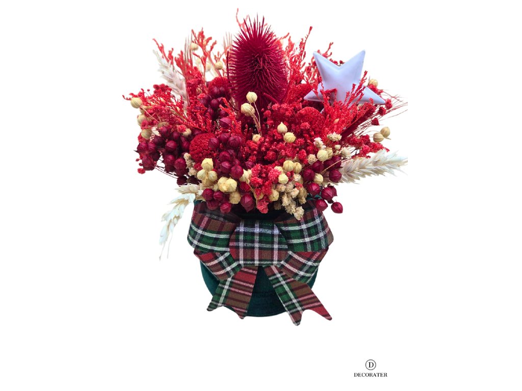 Výrazný vánoční flower box v červených tónech se stabilizovanými květinami. Krásný celé měsíce bez zalévání.