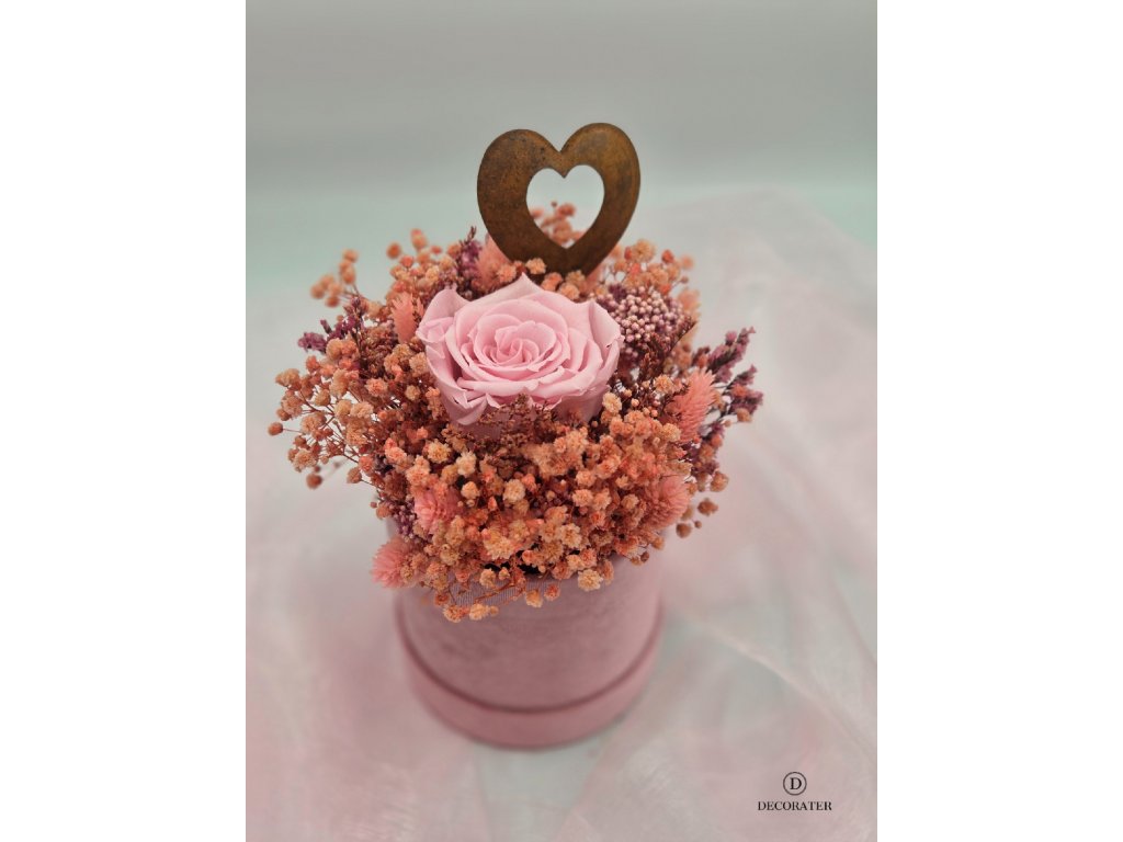 Elegantní flower box v růžových tónech se stabilizovanou růží a jemným srdíčkovým detailem. Nadčasová dekorace bez potřeby péče, která zaujme na první pohled.