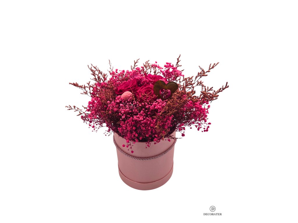 Elegantní flower box v něžné růžové krabičce je tvořen kombinací stabilizovaných růží a pečlivě vybraných sušených květin v romantických odstínech růžové a vínové. Dominantou je detail kovového srdce, který z této dekorace dělá ideální dárek k Valentýnu, výročí nebo jako stylové vyznání lásky.