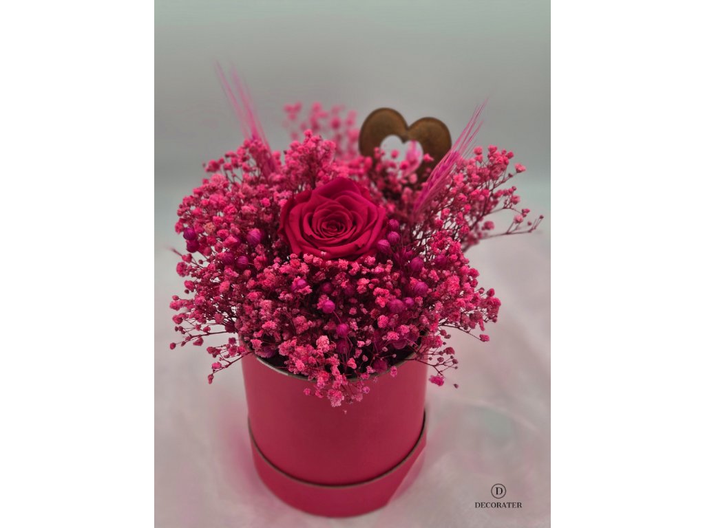 Tento flower box je oslavou výrazných barev a silných emocí. Dominantní stabilizovaná růže v hlubokém magenta odstínu je obklopena bohatou kompozicí sušených květin v sytých růžových a malinových tónech, které aranžmá dodávají objem, strukturu a luxusní vzhled.