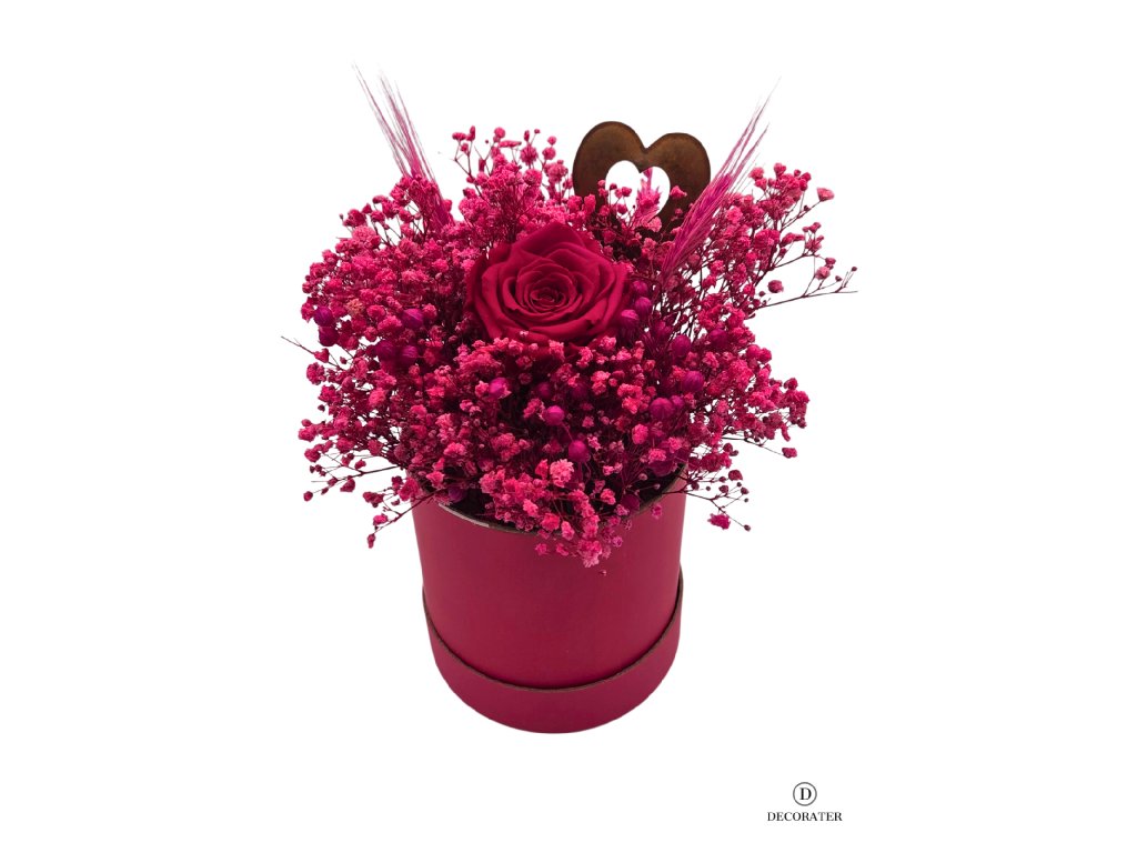 Celé aranžmá je zasazeno do elegantního kulatého boxu v ladícím tmavě růžovém odstínu, který podtrhuje celkový charakter dekorace. Kovové srdce dodává flower boxu symboliku lásky a dělá z něj ideální dárek pro výjimečné příležitosti – Valentýn, výročí, narozeniny nebo jako výrazné gesto beze slov.