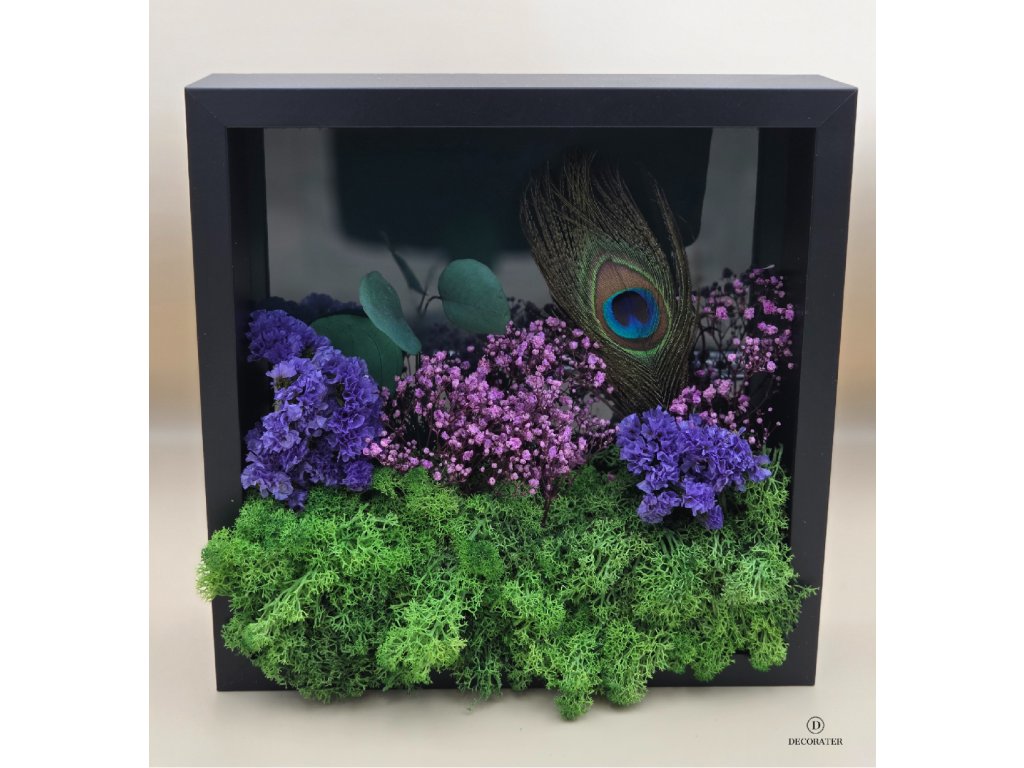 Elegantní květinový obraz v černém rámu s pestrobarevným pavím perem, fialovými a růžovými květy a sytě zeleným stabilizovaným mechem – luxusní dekorace pro milovníky originality.