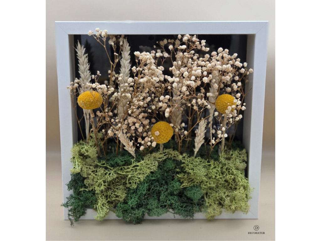Tento jedinečný květinový obraz „Letní louka ve stínu rámu“ je originálním spojením přírody a designu. Ručně tvořená kompozice využívá stabilizované mechy v odstínech svěží zelené, jemné sušené traviny a drobné květy gypsophily doplněné o sytě žluté kulovité květy craspedie. Vše je zasazeno do minimalistického bílého dřevěného rámu, který zdůrazňuje přírodní struktury a barvy. Díky stabilizovaným materiálům si obraz zachová svou krásu po mnoho let bez nutnosti údržby či zalévání. Ideální pro moderní i rustikální interiéry, kanceláře nebo jako originální dárek pro milovníky přírody.